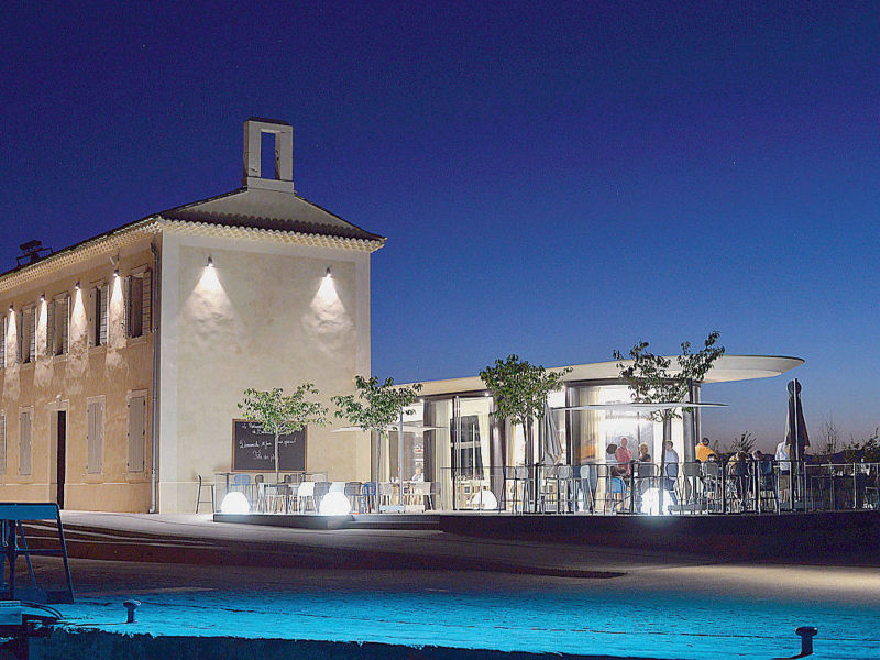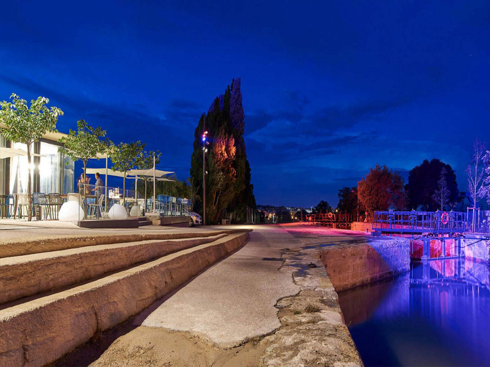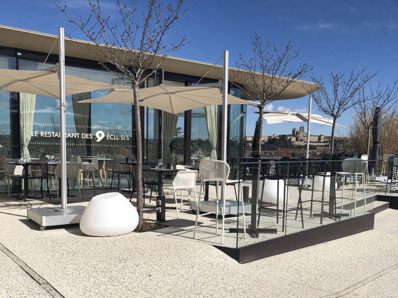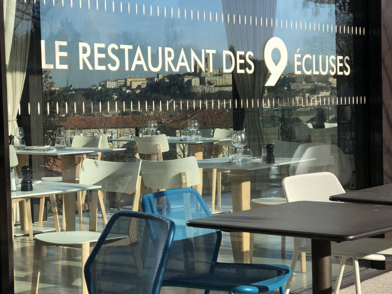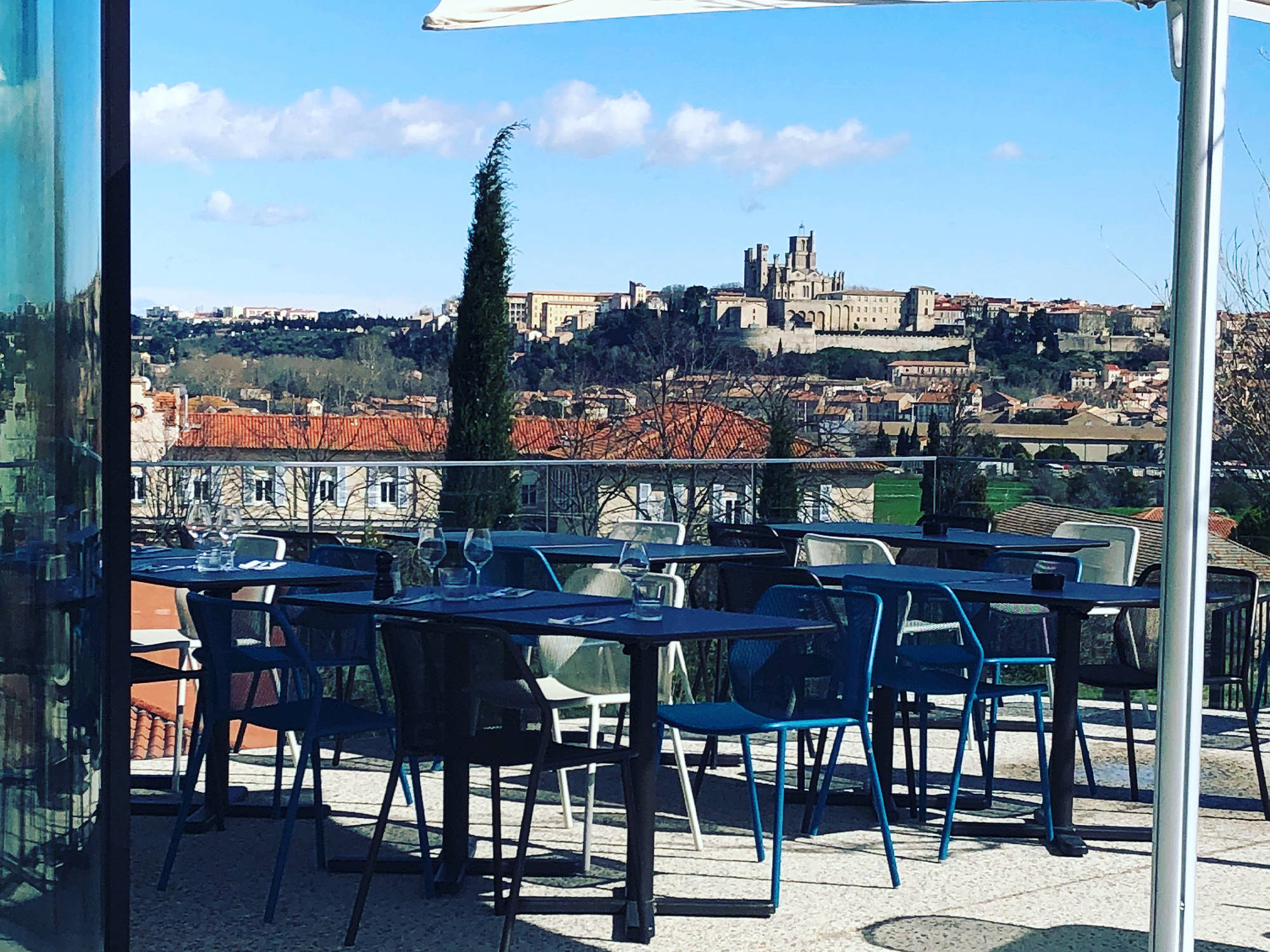 With its majestic glass roof shaped like the prow of a barge, the restaurant's dining room overlooks on one side the plain of the Orb and the Biterran acropolis, and on the other the Fonseranes lock staircase.