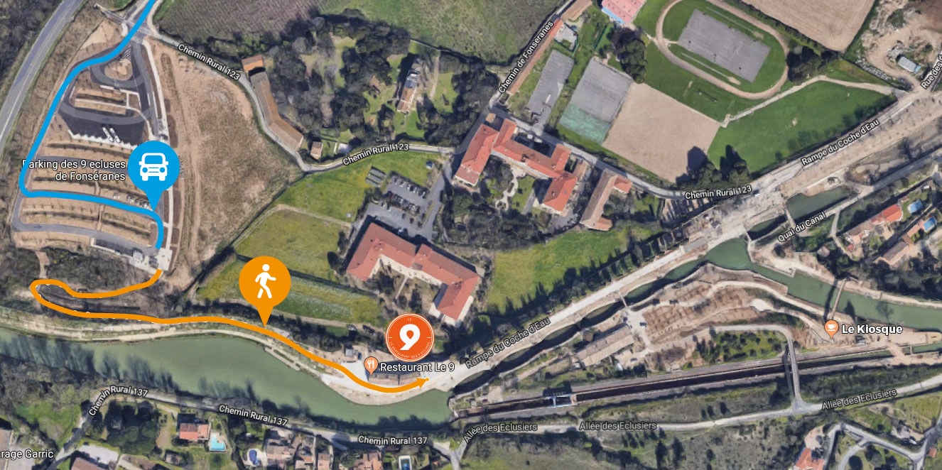 Depuis le parking des 9 écluses, emprunter le cheminement en bois derrière la caisse automatique et longer le canal vers la maison du coche d’eau pour se rendre au restaurant.